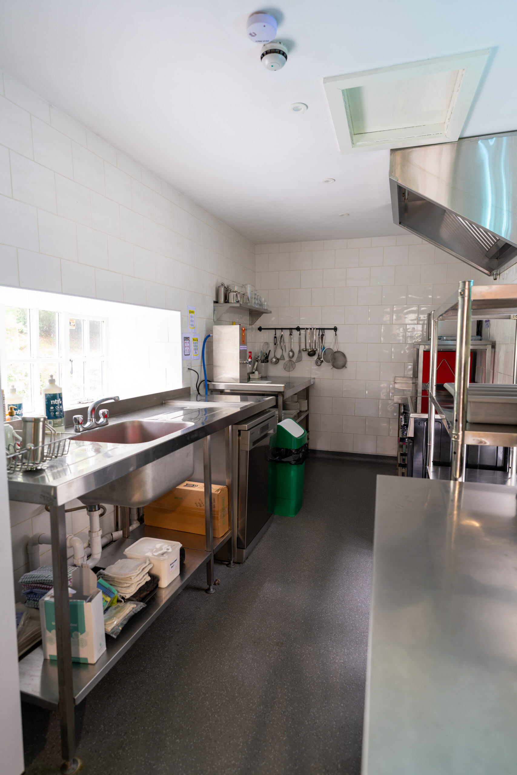 The fully equipped kitchen is beside the communal room and includes a cooker, microwave, crockery, cutlery, and cooking utensils. Extra shelving has been added for better storage of food and drinks.